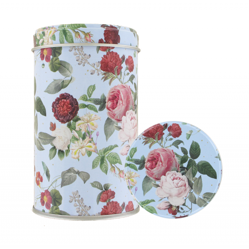 Boite à thé cylindrique en métal. Dimensions: hauteur 12,3cm, diamètre 7,3cm.