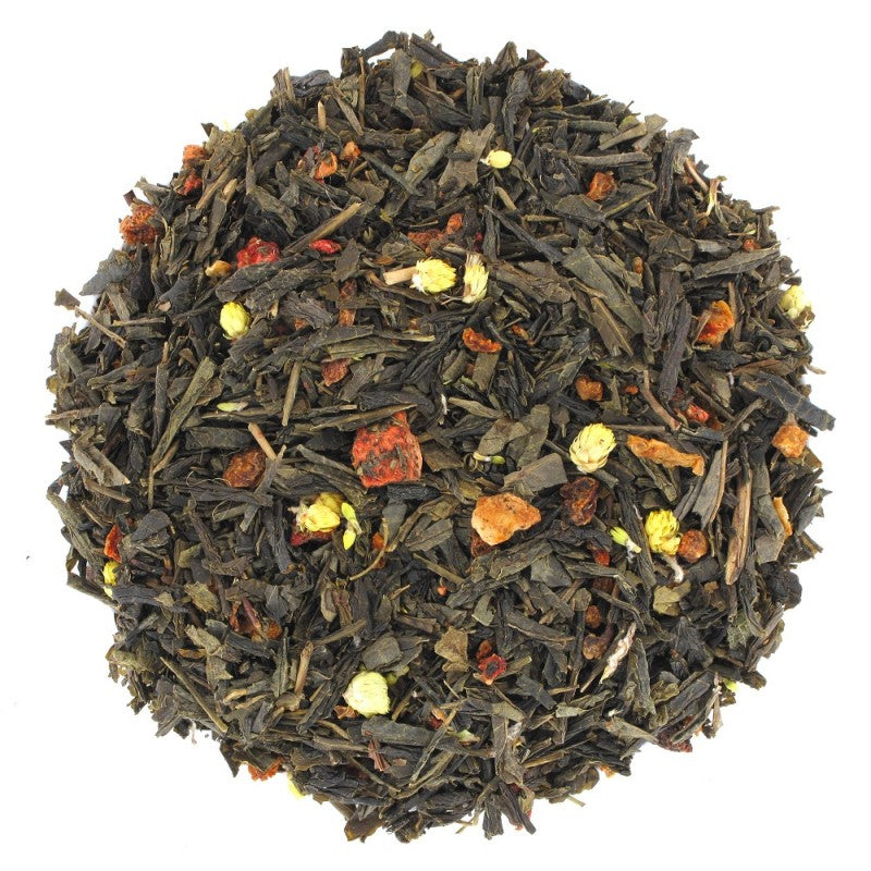 - Composition : Thé vert Sencha, écorces d'orange, morceaux de fraise, fleur d'immortelle, arôme naturel de fraise et d'orange.