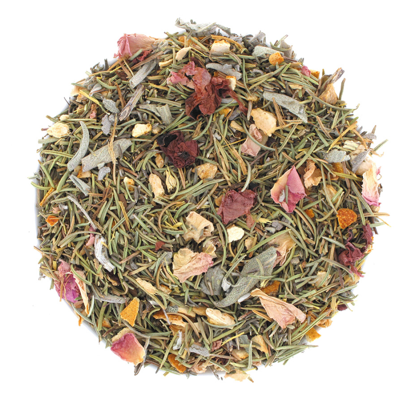 - Composition : Romarin*, thym*, gingembre*, sauge*, écorces d'orange douce*, réglisse*, arôme naturel* de bergamote, pétales de rose*, pétales de coquelicot*.