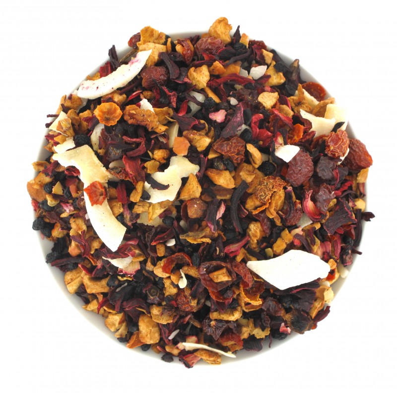 - Composition : Morceaux de pommes, hibiscus, cynorrhodon, baie de sureau, chips de coco, arômes naturels.
