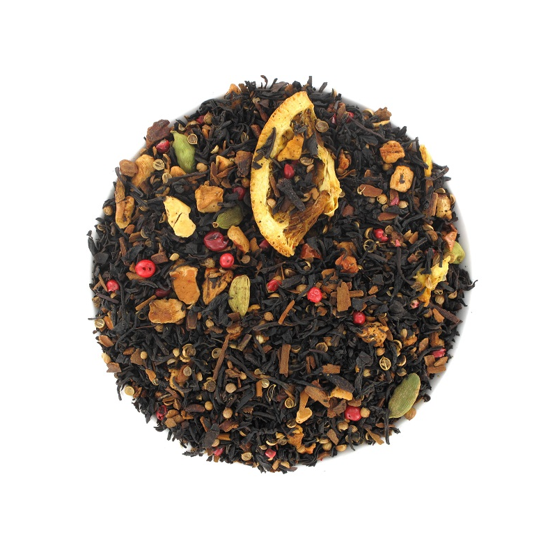 - Composition : Thé noir indien, pomme cubes, cannelle, coriandre fruits, arômes naturels, cardamome, orange tranche, poivre rose, girofle.