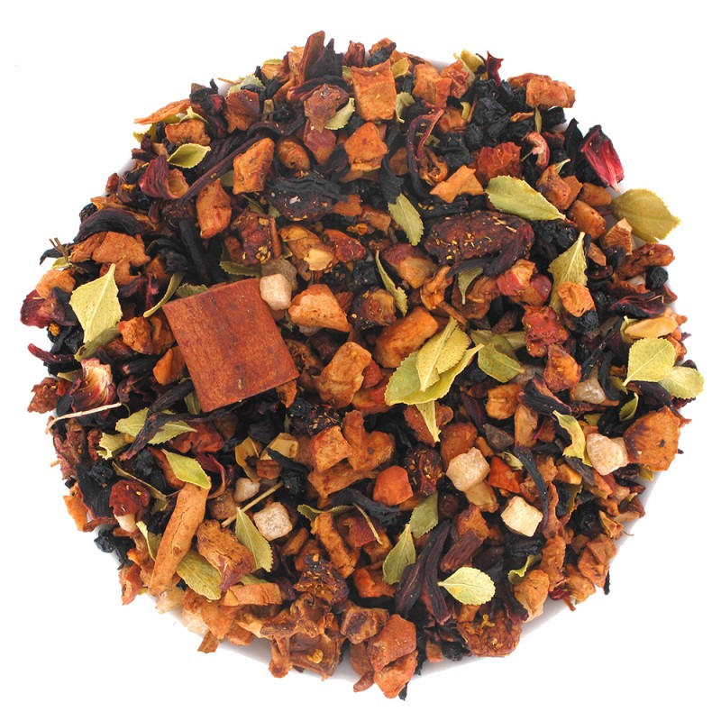 - Composition : Morceaux de pomme, fleurs d'hibiscus, baies de sureau, écorces de cynorhodon, tranches de pomme, viscum, bâtons de cannelle, AMANDES effilées, arôme, girofle.
